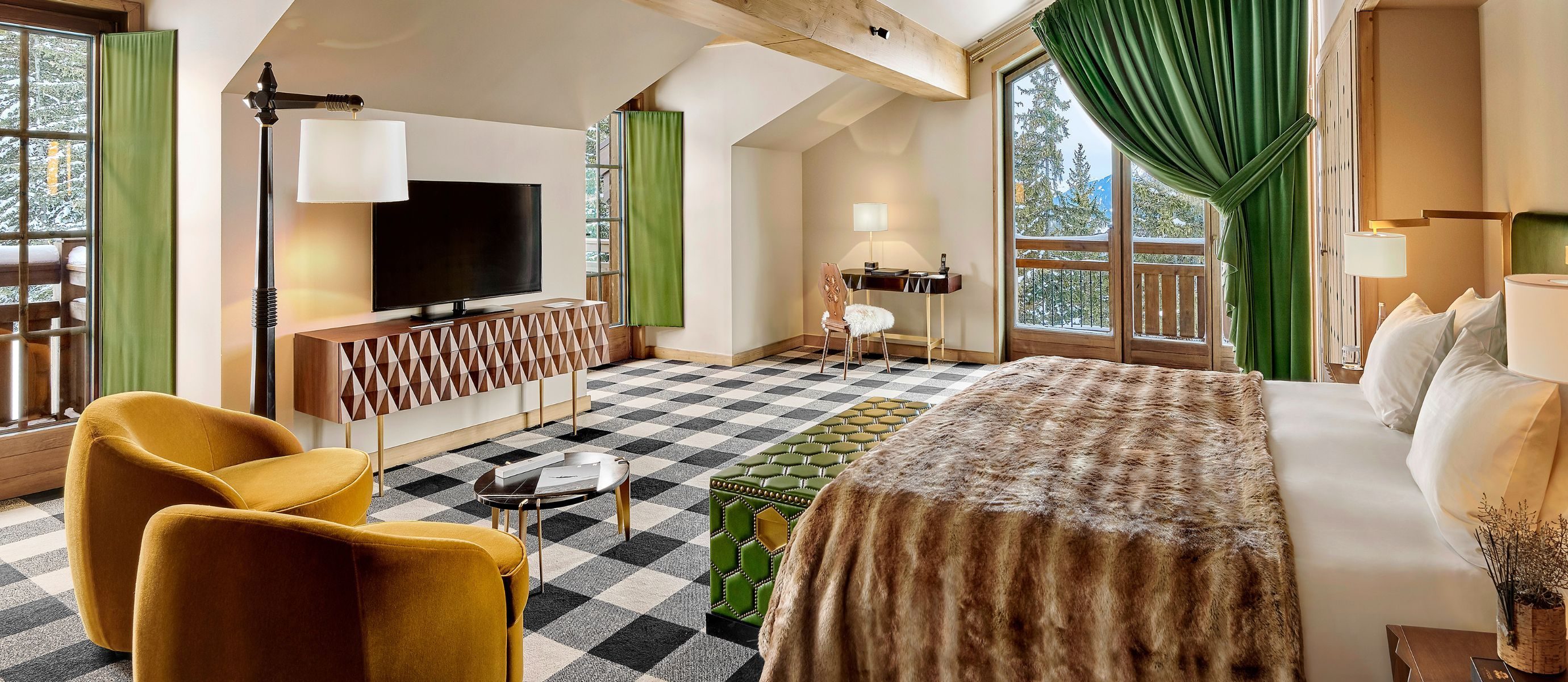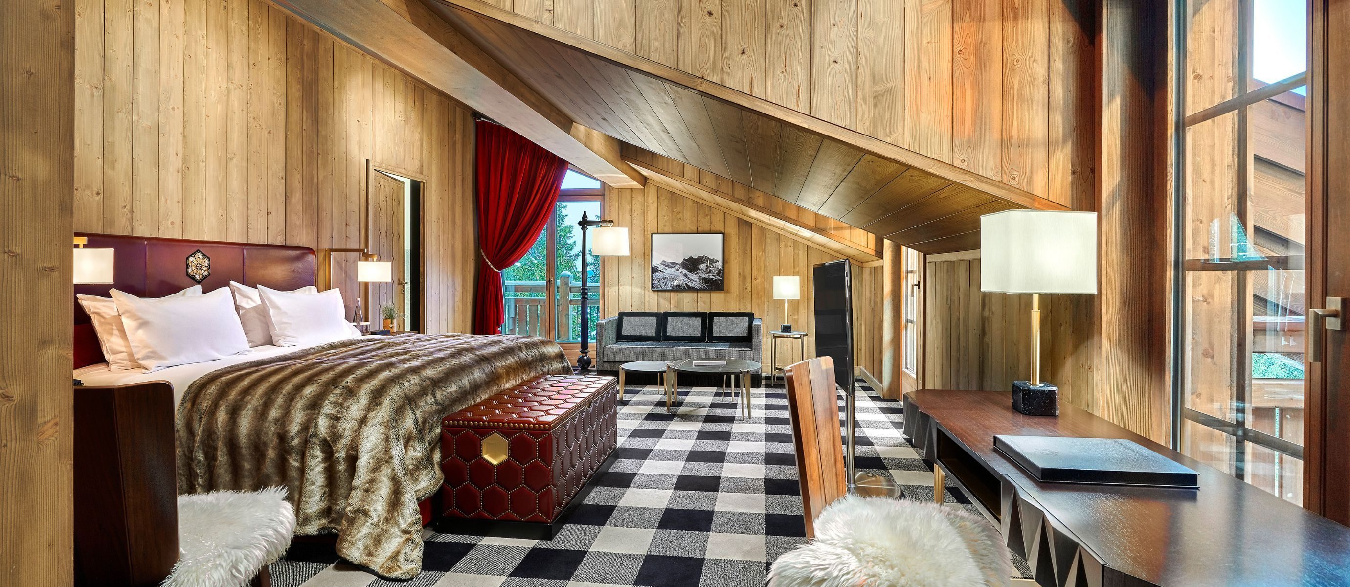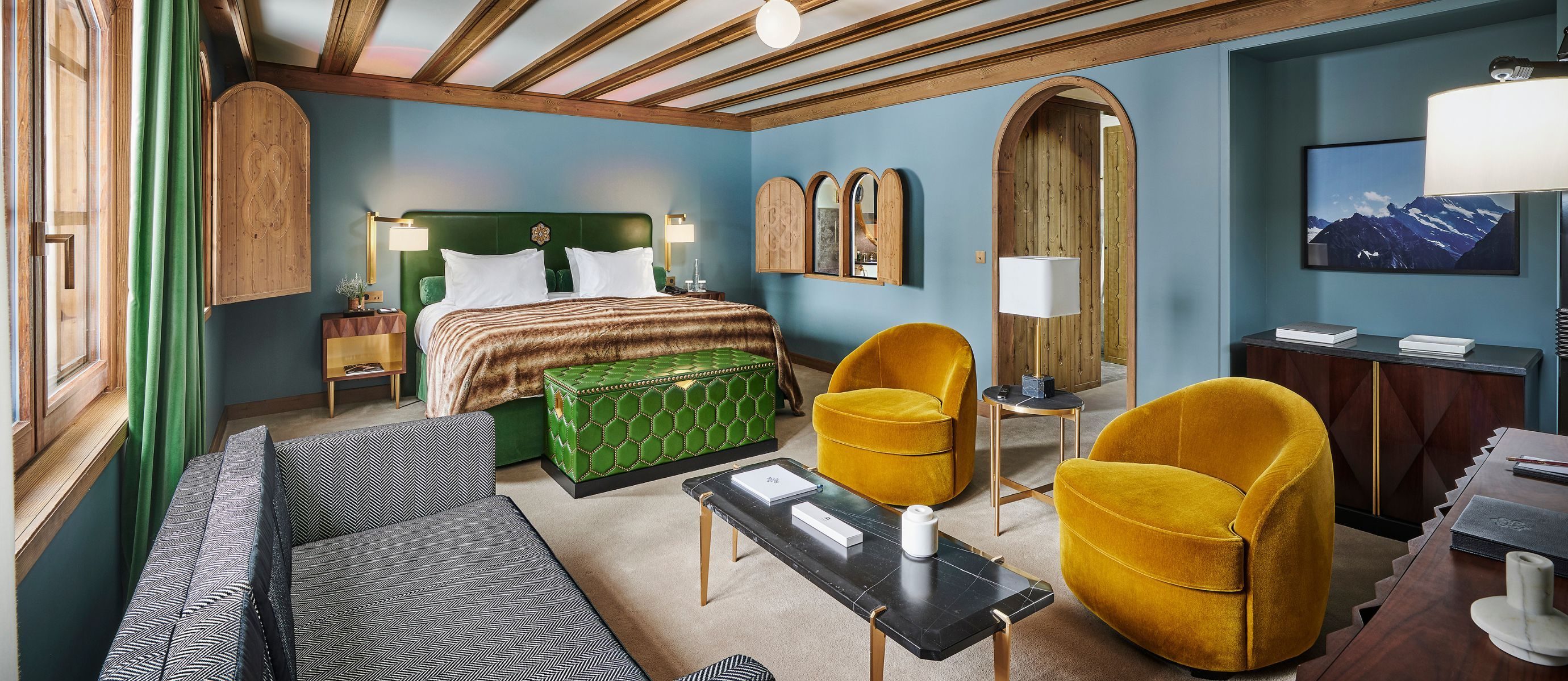 The chalet is extraordinarily spacious, offering 5,920 square feet of discreet luxury. Its five bedrooms and seven bathrooms are all finished in a modern, colourful style by celebrated Parisian designers India Mahdavi and Joseph Dirand. They even designed the lift.