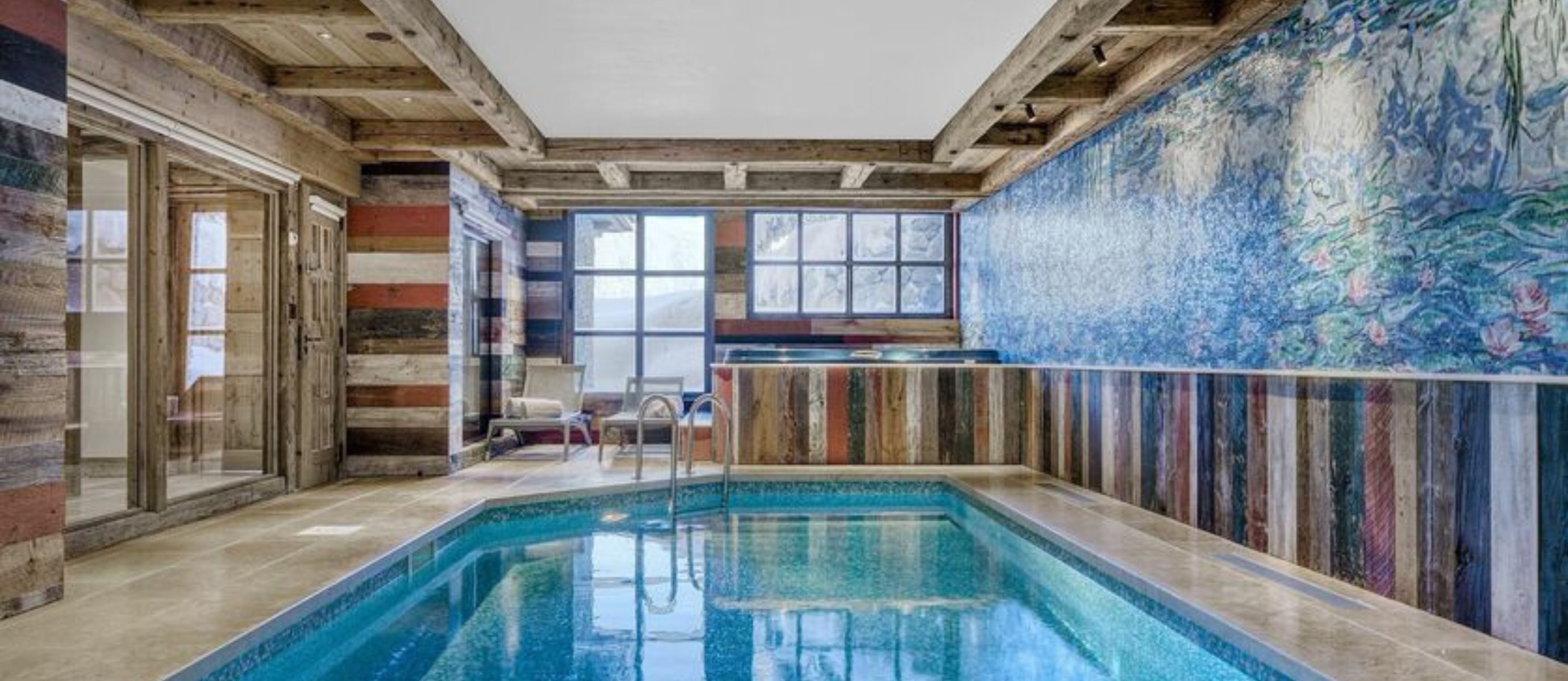 The ground floor houses a spacious indoor swimming pool with jacuzzi and hammam, an independent massage room, and cosy children’s playroom. On the 2nd floor, you will find a main living area with an open fireplace, kitchen, and dining room with large bay windows giving views of the Vanoise peaks. There is also a terrace to relax on while indulging in the uninterrupted views.
